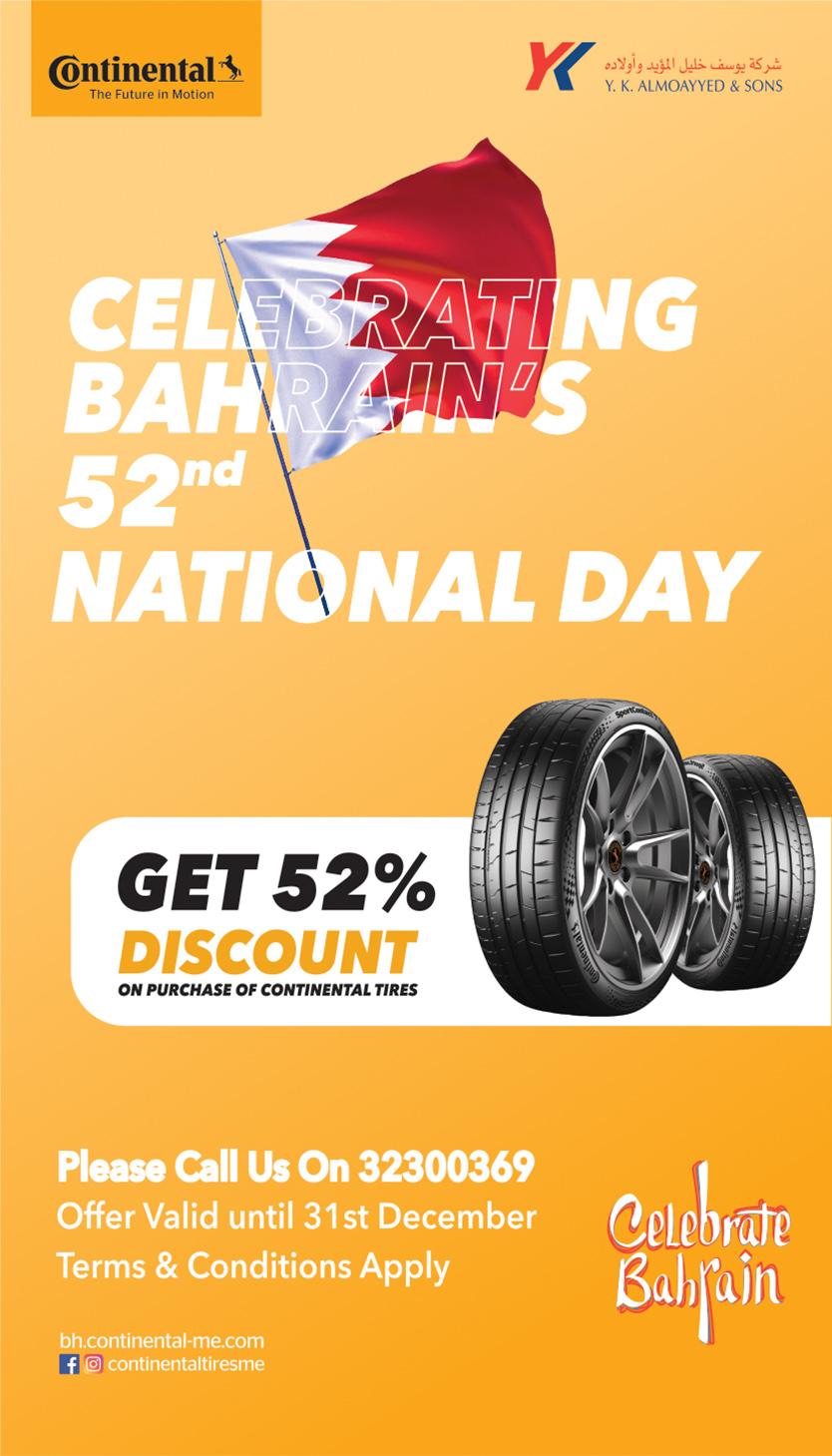 لفترة محدودة، وتكريما لليوم الوطني ال 52 للبحرين، نقدم خصما مذهلا بنسبة 52٪ على جميع إطارات كونتيننتال. نعم، لقد قرأت ذلك بشكل صحيح - خصم 52٪!